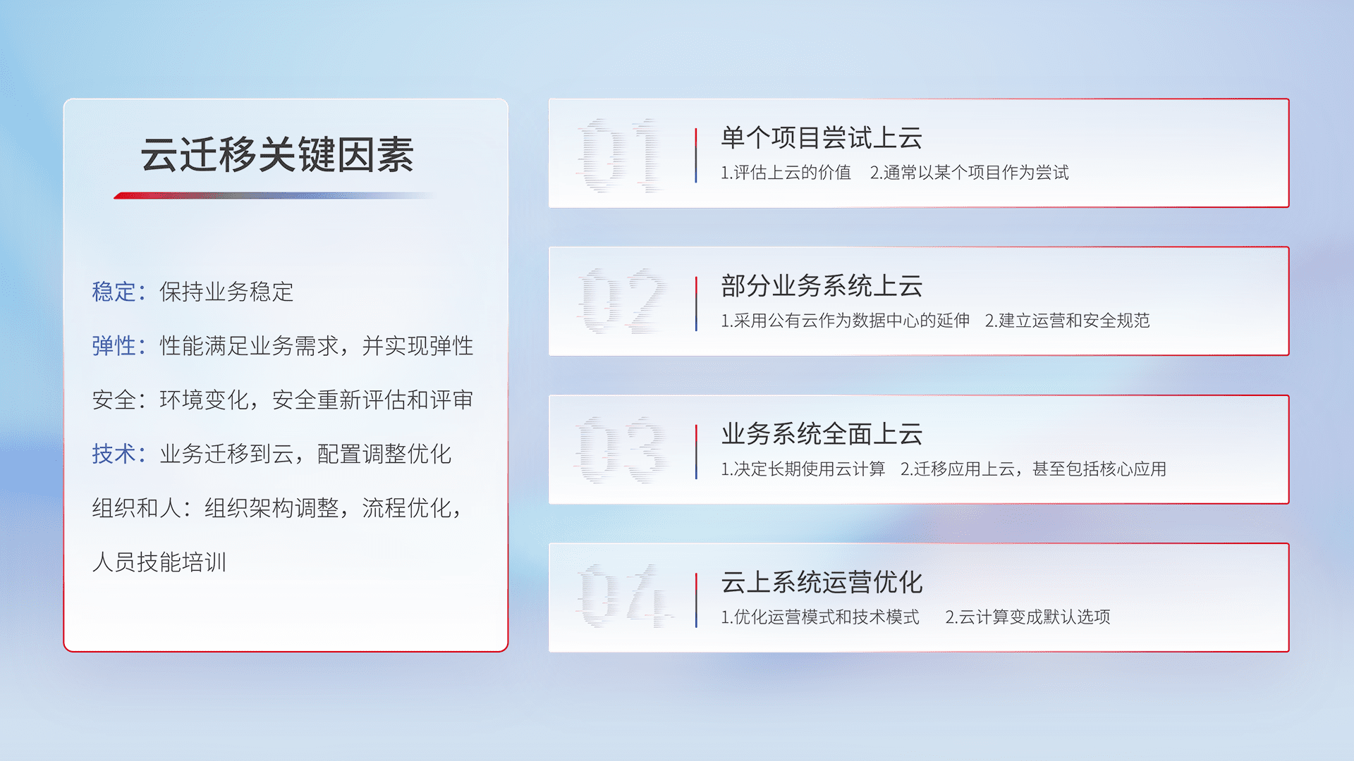 结合实际业务,,从规划设计、、、、云平台选型、、云原生改造、、数据迁移、、、集成交付,,,迁移全过程为客户识别最佳上云路径,,,做好风险识别管理,,,,设计网络架构、、、身份权限、、安全审计合规、、、操作审计、、、、日志审计、、监控告警策略、、、、多站点容灾设计等,,对云上基础设施进行整体规划,,,提升IT治理水平,,,,以满足弹性、、高可用、、、、高性能的需求。。。