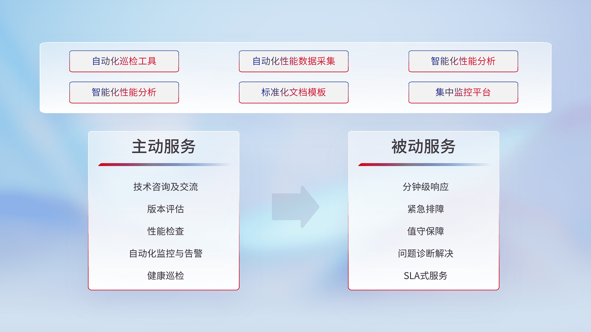 智能化工具和标准化文档,,,,保障服务质量,,,,提供主动服务(包含技术咨询、、版本评估、、、、性能检查、、自动化监控与告警、、健康巡检)和被动服务包含(分钟级响应、、、紧急排障、、、、值守保障、、、、问题诊断解决、、、、SLA服务)。。。